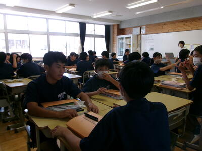 1・2年生は本日も、元気に登校し、集中して学習に取り組む姿が各学級でみられました。本日は、1年3組4時間目社会の授業の様子を紹介します。