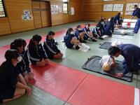武道場では、昨日に引き続き、1年生の救命講習が行われました。グループのメンバーで協力し、役割を交代しながら、声をかけ合って取り組む姿がありました。胸骨圧迫や人工呼吸など、一つ一つの動きをしっかりと行い、「救命」について真剣に考える機会となりました。