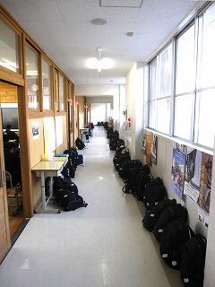 テストにともない、かばんを廊下に並べた様子。