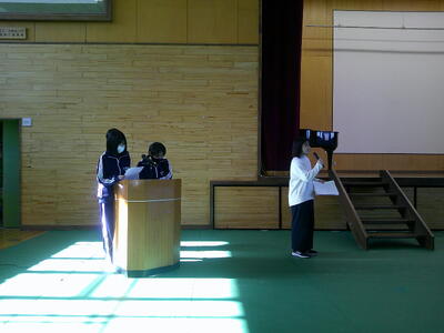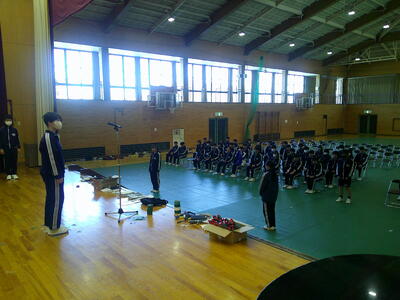今日の5時間目、2学年は体育館で明日の立志式に向けた司会・発表練習を行いました。限られた時間の中、先生や司会の指示を聞いて一通りの式の流れを確認することができました。